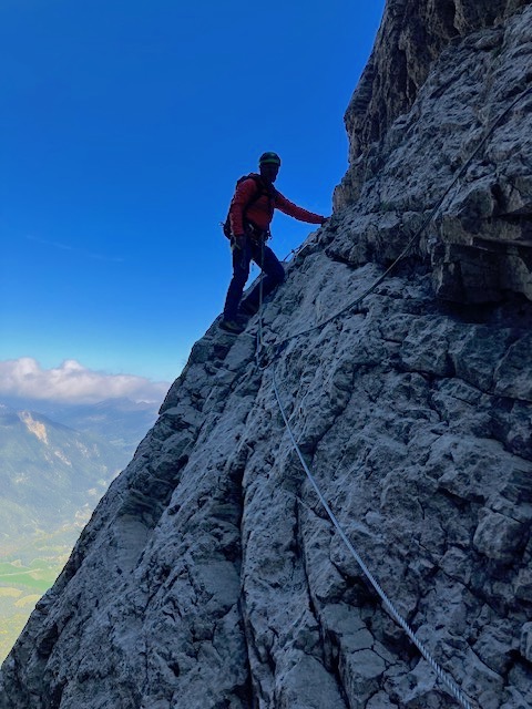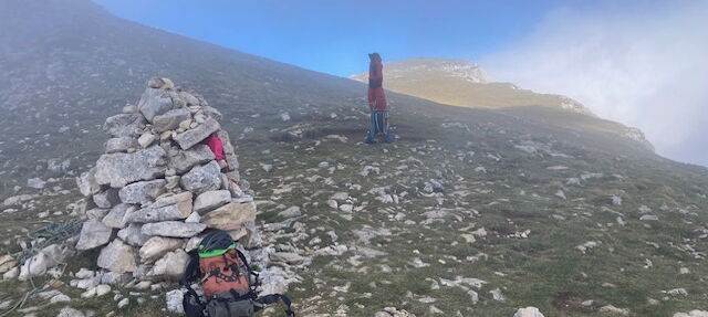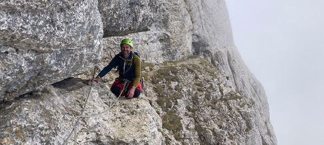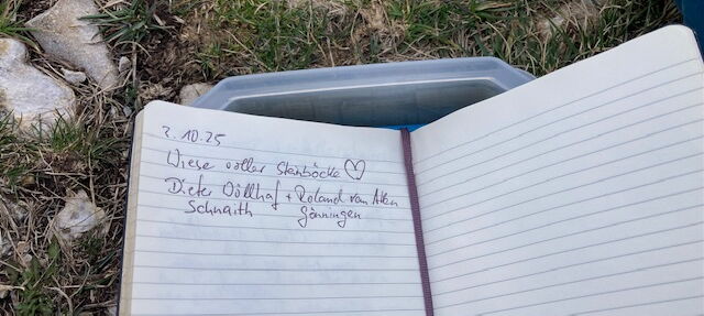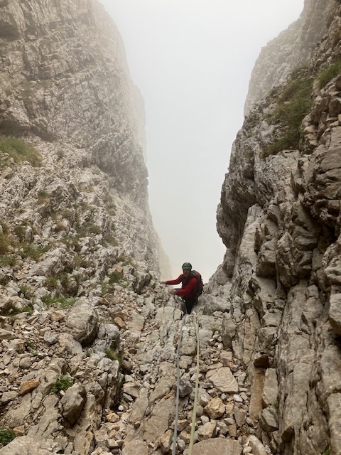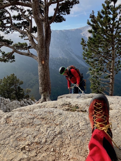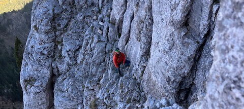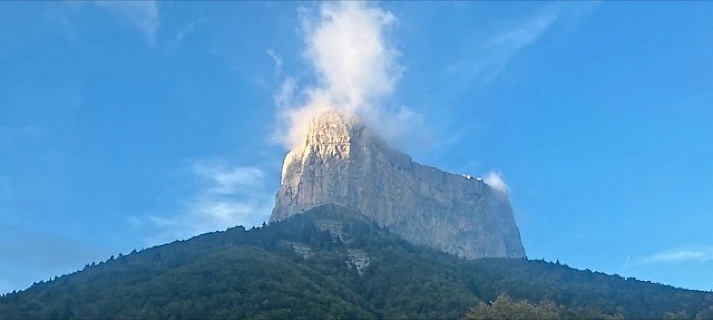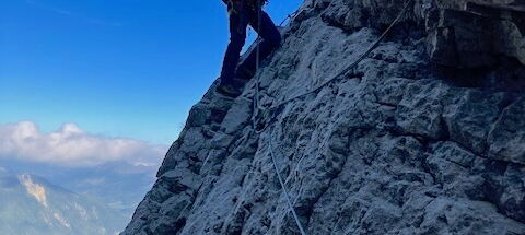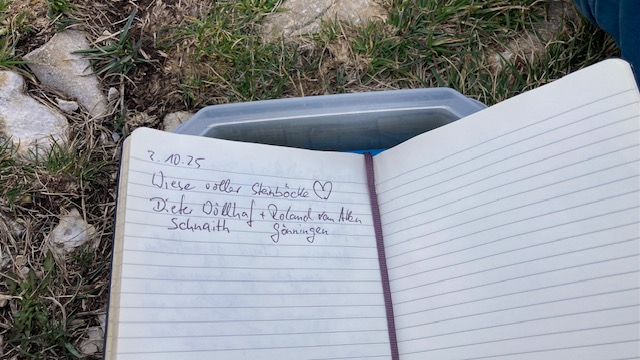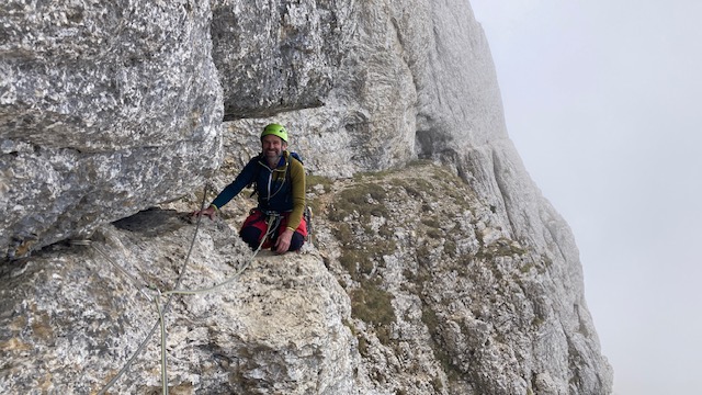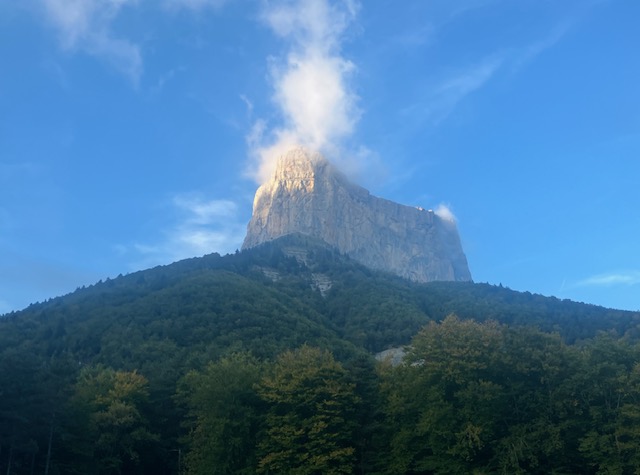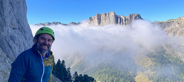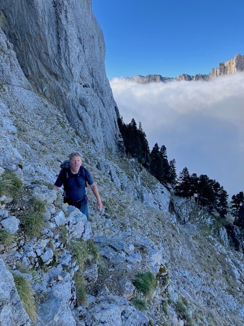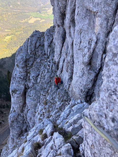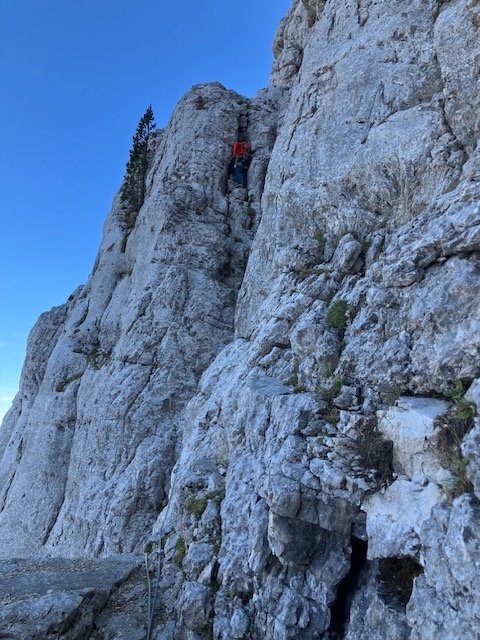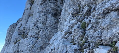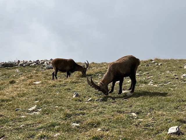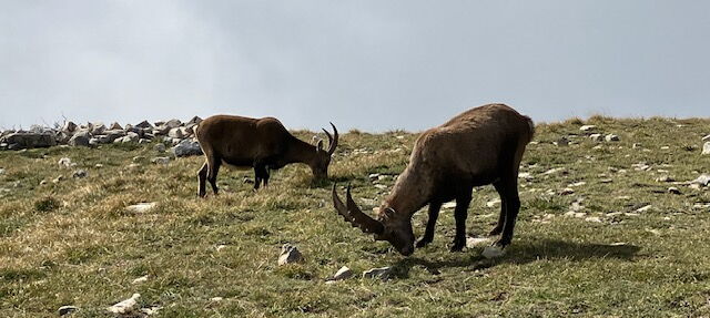 2. Oktober 2025: Mont Inaccessibilis erstbestiegen von Antoine de Ville im Jahre 1492 – die Geburtsstunde des Alpinismus - Nachdem mein 1. Besteigungsversuch des berühmten Gipfels im Sommer 1981 zusammen mit meiner damaligen Freundin und heutigen Oma unserer Enkel aufgrund des leichtsinnigen, aber aus Sparsamkeitsgründen nachvollziehbarem Verzehrs einer schon leicht aufgewölbten Miesmuschelkonserve gescheitert war, bot sich nun endlich die Gelegenheit, auf dem Weg nach Bedoin die Schmach zu tilgen. Also vom einmalig schönen Camping a la Ferme in Chichilianne mit dem Pedelec (ohne Akku, der lag zuhause am Ladekabel) zusammen mit Agger zum PP in Richardiere gestartet und in 1,5 Stunden über den Col de l’Arpet hoch zum Einstieg des Normalweges. Die Route ist trotz verwickelter Wegführung leicht zu finden: immer den für Zweiergelände reichlichen Bohrhaken und vor allem immer dem Speck nach, also für Vegetarier völlig ungeeignet … . In Quergängen sowie im Ausstiegskamin hängen außerdem nagelneue Stahlseile rum, die sehr gut zur Absicherung taugen (und den Bergführern im Sommer helfen, ihre um die 100 Kunden/Wochenende hochzuhieven …). Nach gemütlichen 3 Stunden waren wir auf der Gipfelwiese und wurden von einem Rudel Steinböcke begrüßt, die in 20 m Entfernung in aller Seelenruhe grasten! Als echte Sportkletterer schenkten wir uns den höchsten Punkt der Wiese und machten uns an den Abstieg durch brüchige Schuttrinnen und zum Schluss 25 m und 50 m Abseilfahrt in einen engen Kaminschlund. Nach 9 Stunden abwechslungsreicher Bergfahrt saßen wir wieder beim verdienten Bier am Campingbus. Fakten: Mont Aiguille 2087 m (Vercors) 11 SL / Kletterlänge über 350 m / Schwierigkeitsgrad 2 - 3+, mit Speckfaktor mehrere Stellen + 1/2 Grad … (DW)